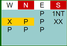 Kanskje, men ikke umulig. For øst ser den truende kløveren og hjerter ess, så her kan det godt haste med å få tatt motspillstikkene. Finmes motspillet tar Ø/V seks ruterstikk og fire sparstikk som gir fire redoblede bet i sonen, festnoteringen +2200 til Ø/V.