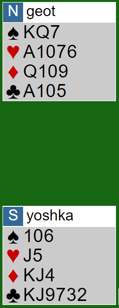 Ja, jeg var ikke i tvil. Men seks hjerter hos vest og kun en hos øst er det skyhøy prosentsjanse for at øst har kløverlengde. Så jeg spilte kløver ess (begge fulgte med småkort) og fortsatte med kløver 10 som fikk løpe da øst fulgte med liten en gang til. Men nei, i downperioder går ting galt: