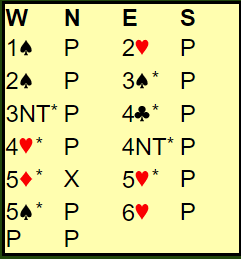Hva vest kan forvente med hensyn til hvor god hjerter øst må ha for det forslaget, og med hvilke kort vest bør passe på 6 hjerter og når hun skal plukke ut i 6 spar er kanskje litt mer uklart?