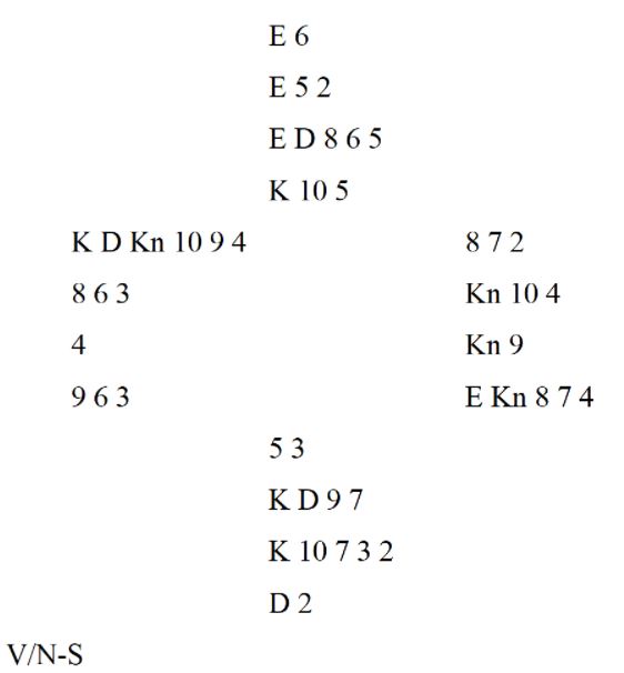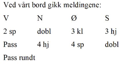 Hjerter ess i utspill og mer hjerter til damen. Nå prøvde jeg liten ruter til damen, men ruter ess stjal spillefører, og da var det for sent. Makker kom inn på spar ess og spilte mer hjerter, men siden spilte Gerd Marit Harding kløver til syveren, og dermed fikk vi bare med oss tre bet og minus 14 av 15 mulige. Jeg må skifte til kløver dame i stikk tre. Da får jeg en stjeling og den fjerde beten er et faktum til pluss 11 i stedet. To par hadde klart å melde 6 ruter.