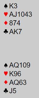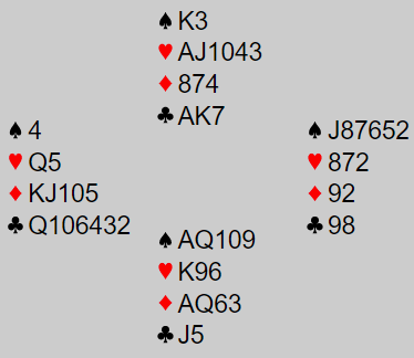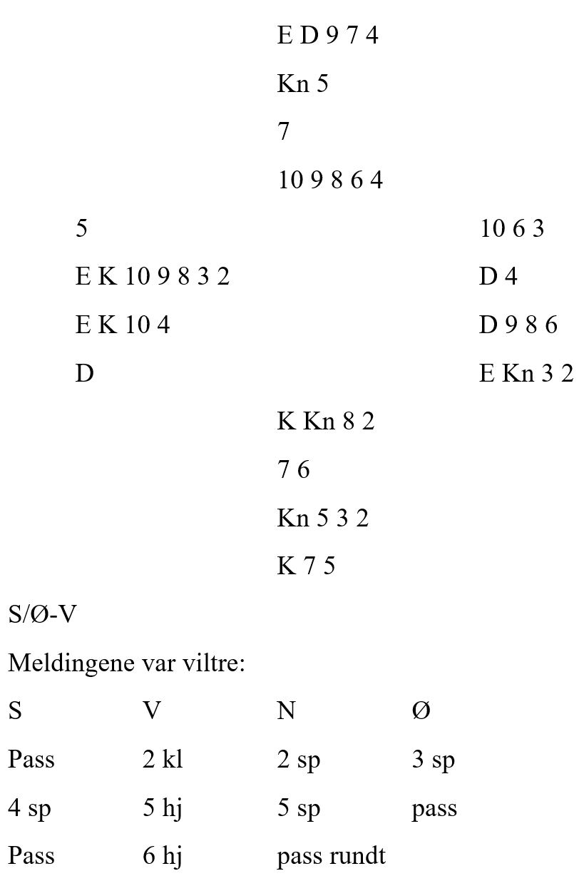 Nå skal du jo bare ta ut trumfen, men skrekk og gru - den sitter 4-1 i mot. Hvis du nå trekker fire trumf så kan motparten ta haugevis med beter i kløver inne på hjerter. Hvis du heller tar to trumf, oppdager misæren, og deretter går over på hjerter - ja, da kan vest gi makkeren sin ruterstjeling. Og selvfølgelig, hvis du forsøker å avblokkere ruter knekt før du går over til hjerter - ja, da stjeler også øst. Her har du rett og slett gitt deg sjøl ris til egen bak, og burde ha gått ei fortjent bet!