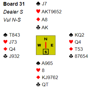 Makker åpne med 1 ruter. Over 1 hjerter fra meg sa han 1 spar. Nå kunne jeg si 3 hjerter som krav, sleminteresse og det setter trumfen. Fargen er ikke egentlig helt god nok til det, men det var syvkorts, og jeg ville prøve å gjøre det enkelt. Makker løftet til 4 hjerter. Det tyder på en miserabel hånd (ville kontrollmeldt med god hånd), men noe må han ha, for han åpnet jo. For å minske sjansen for at de skulle funne riktig utspill hoppet jeg rett til 6 hjerter. Det kunne kanskje være slik at de har to sparstikk å hente, men kanskje kommer kløver eller trumf ut så forsvinner spar på ruterfargen. Vel, det var i alle fall en tanke bak det, men slemmen var ikke god selv om den hadde sjanser. Spar konge kom i utspill fra øst. Dårlig nytt?