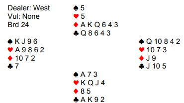 Et langt meldingsforløp inkluderte en misforståelse da han ene spurte om noe høyere enn trumfen på femtrinnet, det for å finne ut hva som var riktig kontrakt, 6 kløver eller 6 ruter. Overtenking, synes jeg, og en slik melding når man allerede er i lilleslem bør bety at man er intererssert i storeslem. Og det meldte nord som trodde de hadde alle nøkkelkortene (essene og trumf konge)!