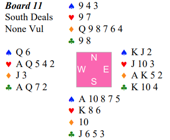 Kun et par spilleførere i det 48 par store feltet spilte hjerter 3 i første hjerterrunde, men de fikk ikke noe ekstra for god teknikk denne gangen, for hele spillet satt slik: