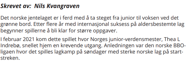 Det blir bulletiner fra arrangementet, og velkomstbulletinen er allerde lagt ut. Vi tar oss den frihet å sakse litt fra den, en artikkel om "Årets beste juniorspill i 2021" som Thea Indrebø (som deltar på Os i helgen) stod for.