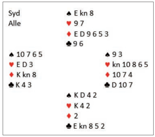 Vest spiller ut hjerter dame mot 3NT. Øst følger med hjerter 5. Ser du en god plan for å vinne 9 stikk?