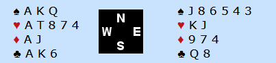 Det er svært gode sjanser for å kunne sette opp det manglende stikket i hjerter. En mulighet er å ta finessen, men det er langt bedre å prøve å stjele god fargen i og med at antallet inntak i vest er betydelig. Med hjerteren 3-3 eller 4-2 (84 % sannsynliget), eller eventuelt dama singel, vil det gå fint å sette opp det nødvendige stikket i hjerter.