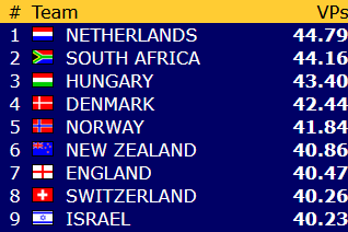Åpen klasse: Norge - Australia 8,8 - 11,2 (IMP-score: 25 - 29) Norge - Sverige 13,04 - 6,96 (IMP-score: 47 - 36) Norge - De forente arabiske emirater 20 - 0 (IMP-score: 99 - 9)