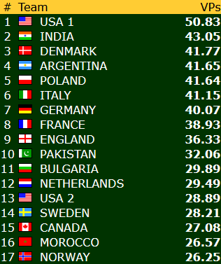 Norge - USA 1 3,42 - 16,58 (IMP-score: 17 - 46) Norge - Guadelope 20 - 0 (IMP-score: 69 - 2) Norge - Frankrike 2,83 - 17,17 (IMP-score: 19 - 52)
