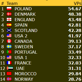 I veteranklassen ble det også buttspill for Norges del, men på en helt annen måte. I kampen mot Guadelope stoppet nemlig begge bordene slapt i 4 spar.
