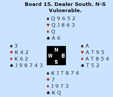 Og det var en god stamp, for 4 spar var enkelt å vinne siden Ø/V sine AK i to farger ga kun to motspillstikk totalt.