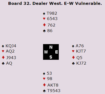 Mine lagkamerater stoppet også i 4NT. Heldigvis meldte Ø/V 6NT med øst som spillefører mot oss. Min makker Nick Jacob doblet og tok to ruterstikk. Greit nok, så slapp jeg muligheten for å bomme et så ekkelt utspillsproblem...