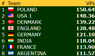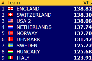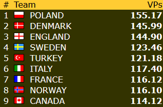 Norge er nummer 19 med 70,84 VP. Avstanden opp til åttendeplassen er dermed rundt 40 VP, omtrent den samme som etter gårsdagen.