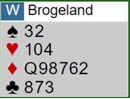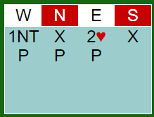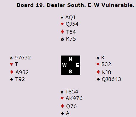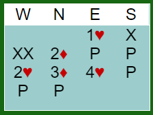 Ved det andre bordet ble det enda verre da øst ikke støttet med det samme (cue raise etter 2 hjerter inn), og vest ikke trodde spillet så slik ut. Så da N/S var i 6 hjerter doblet de og lot dem spille 6 hjerter.