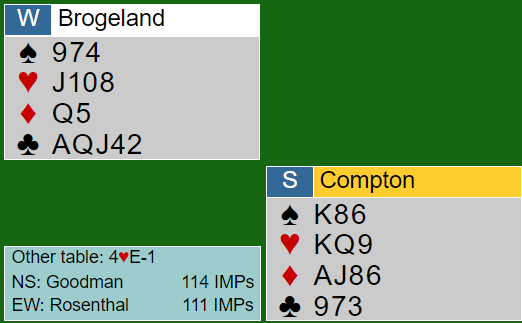 Mot østs 4 hjerter spilte Compton ut ruter ess og fortsatte fargen til damen, kongen og stjeling hos spillefører.