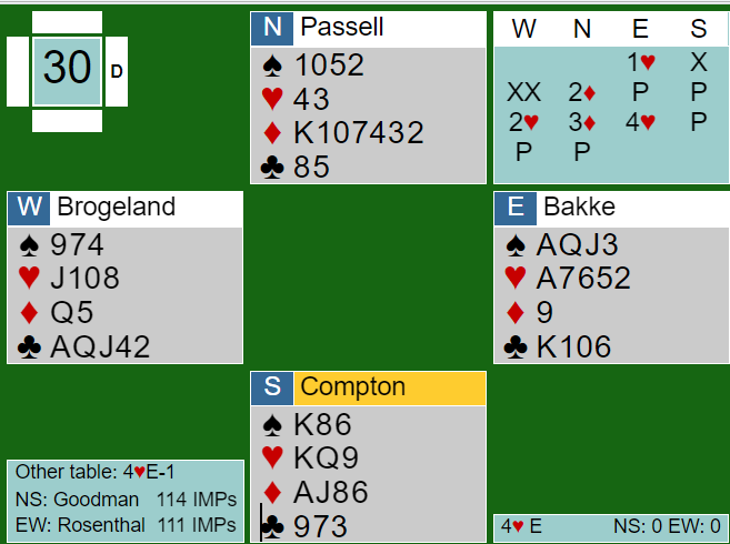 Før det siste spillet lå imidlertid ROSENTHAL fortsatt under med noen få imp. En motspillsfeil mot Christian Bakkes 4 hjerterkontrakt førte til at den føk hjem. Det ble en bet i samme kontakt ved det andre bordet. Det ga 10 IMP som kom usedvanlig godt med, for dermed var de akkurat foran etter aller siste spill! Det spillet kan du lese om i min neste artikkel her i bloggen.