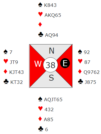 Det er vel flere måter å gjøre det her på, men de fleste måtene bør vel føre til 7 spar. Om nord undersøker (for eksempel via Stenberg 2NT) kan han få vite om kløverkontroll hos syd, og idet han også får vite at trumfen er god nok via Key Card Blackwood må konklusjonen bli storeslem i spar. Nord kan også hoppe til 4 ruter direkte over 1 spar. Uansett har nord så stort stikkpotensiale at han blir storeslemsinteressert.