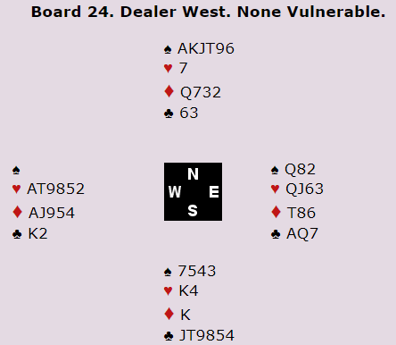 Jeg har dessverre ikke fått tak i hvordan meldingene gikk ved Helness-Helgemo sitt bord, for den norske kampen var ikke på BBO i morges. Det norske paret havnet imidlertid i 6 hjerter.