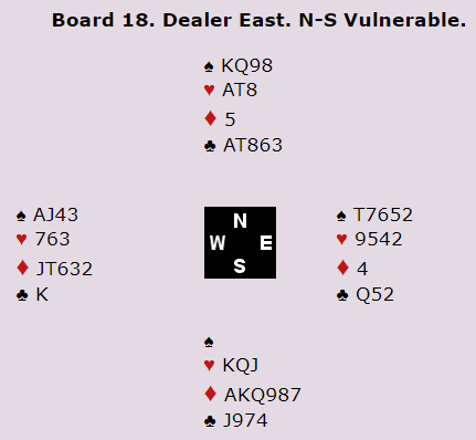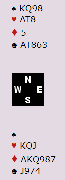 Normalt spilles på hjerterfinesse med slikt. Så syd må ha kongen i den fargen. Dessuten må syd ha minst en ruterhonnør. Slik så hele spillet ut: