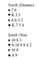 Vest har åpnet med svake 2 spar og har vist KQJ i spar allerede. Det er selvsagt plass til hjerter dame hos han, men det er mye mer sannsynlig at han ikke har de 2 poengene i tillegg.