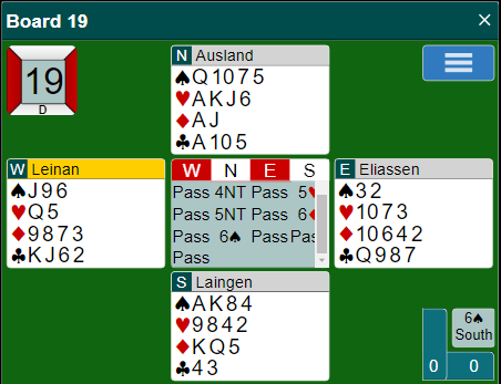 Nord spilte ut hjerter 3. Det var ingen blink akkurat, og svært kostbart da hele spillet så slik ut (bildet under fra det andre bordet):