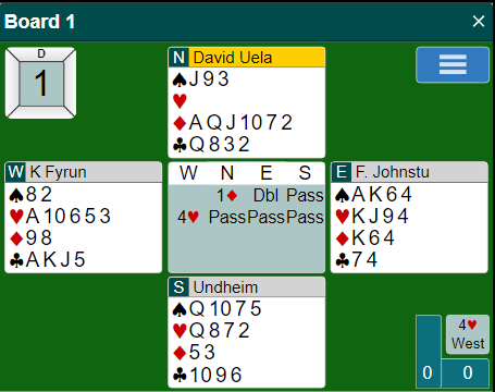 Ved begge bord sa syd pass som selvsagt er korrekt nok, og vest meldte simpelthen det han trodde stod, 4 hjerter. Uavgjort spill da begge fikk elleve stikk.