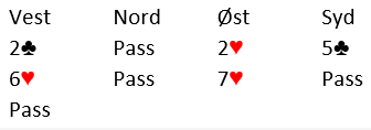 Kanskje, men det blir verre. På samme måte som jeg hevder øst bør legge på til 7 hjerter idet syd sier 5 kløver og vest hopper til 6 hjerter, har øst bra argumenter for å legge på om syd sier 6 kløver og vest 6 hjerter uten å hoppe dit. Men det er klart at siden vest i det tilfellet ikke hopper til 6 hjerter blir det litt mer usikker, for vest er jo en vanvittig presset situasjon pga. 6 kløver-meldingen.