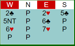 De fleste er enige om at øst nok burde lagt på til 7 hjerter. Jeg fortalte at David Ueland (Klepp BK 1) gjorde det, men han har fortalt meg at meldingene ikke gikk akkurat slik da makkeren Jomar Lygre Undheim på vests plass la inn en storeslemsinvitt. Meldingene ved det bordet gikk slik:
