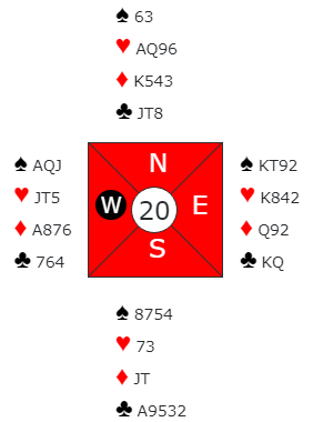 I spill 6, det siste i runde 2 satt vi Nord- Syd igjen i ugunstig sone og hadde dette.