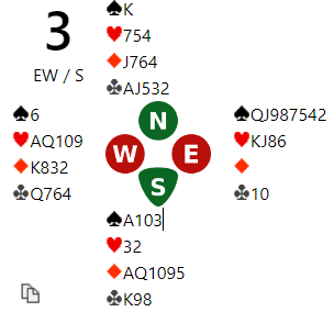 Det kom altså hjerter 3 i utspill, stukket hos vest, trumf til nords single konge, mer hjerter. Det er her spillefører må være på vakt da det lyser en hjerterstjeling i fjeset på han. Den som har tre hjerter må ikke få komme inn og gi den stjelingen som i så fall er beten.