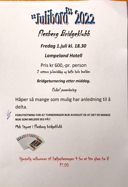 "Etter 2 år med pandemi satser vi i 2022 på en fullverdig festival igjen. Vi håper alle bridgespillere derfor vil ta turen til Lillehammer 5. - 13. august. Det blir muligheter både i NM og Bridge for Alle!"