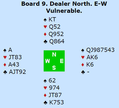 Bare 9 hp men en svært lang og ganske god 8- kort sparfarge ffrister. Et aber er likevel at jeg hadde to ess, men tross det valgte jeg å åpne med 4 spar. Er makker svak kan det godt stå både utgag og slemimot og sperr der de først får meldt på 5- trinnet er effektivt. Det gikk så pass rundt og det var ingen nvansker med å vinne mine 10 stikkk med den hanongode støtten makker Egil Meyer kunne legge opp. Men hadde Vesst i stedet sittet med Syd sinn hånd ville jeg vært klar for to bet. Likevel skal det godt gjøres å få doblet meg og sonen var jo gunstig.