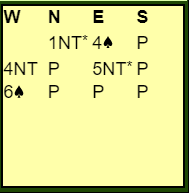 Christian Bakke meldte 4 spar. I disse soneforholdene må det innebære en bra hånd, men det er klart at det ikke alltid er lett for makkeren å vite hvor bra, og hvor godt kortene sitter sammen. Men Tor Eivind Grude (vest) gikk på mot slem med 4NT, og Bakke viste et odde antall nøkkelkort (1 eller 3) samt en renons. Brogeland sa 6 spar. Meldingsforløpet gikk altså slik: