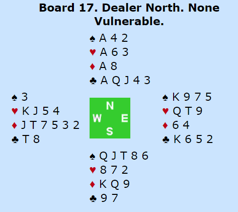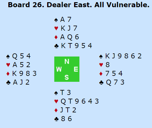 Dette var kampens første spill. Vanlig kontrakt var 4 spar, enten spilt av syd, eller av nord hvis det hadde vært overføringsmelding involvert.