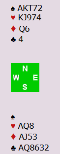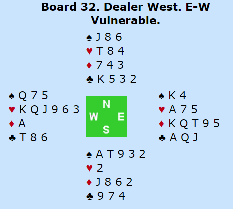 Dette er en helt vanlig 3NT selv uten hjerterstopper, for med 3-3 i hjerter hos N/S avhenger 3NT normalt kun av at hjerteren ikke sitter 5-2 hos motparten. Den satt 4-3, men som du ser satt både ruter og kløver uheldig, og det er bare åtte stikk med kun tre i de to fargene.