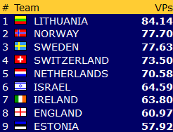 Med 5,20 VP i den kampen falt Norge til 5.plass. Men i de to neste kampene gikk det meget bra for Norge. Først ble Bulgaria feid av banen med full pott til Norge, 20 VP. Det ble fulgt opp med sterke 18,44 - 1,56 VP mot Kroatia. Etter det ligger Norge på 2.plass bak Litauen som litt overraskende leder med en meget høy score (84VP) etter sterk spilling i de fem første kampene.