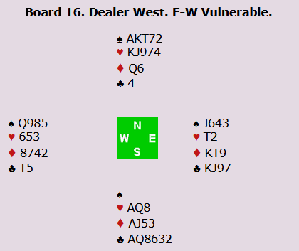 Utspillet var spar 6 som gikk til liten, nieren og damen. Så ruter ess, hjerter til bordet og ruter K-Q for å se om knekten faller. Det gjorde den ikke, og spillefører hadde kun 1+6+3+1 = 11 sikre stikk. Vi som ser alle kortene vet jo at det fra start gikk an å ta tre kløverstikk i dette spillet, kongen sitter jo behagelig i saksen. Men det vet ikke spillefører, spesielt ikke siden syd hadde meldt.