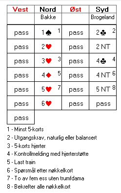 Jeg satt nord i dette spillet. Vest åpnet 1 hjerter, øst svarer 1 NT, vest reverserer (viser sterke kort) med 2 spar og øst melder nå 3 kløver. Vest setter så strek med 3 NT, der øst dermed blir spillefører.