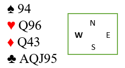 Neppe hvis en skal tro vest og hans limit raise. Han har trolig A-Q-J i kløver og har allerede vist hjerter dame. Det er 9 HP, litt for lite for et limit raise. Derfor er det overveiende sannsynlig at det er han som har ruter dame. Ser du da noen sjanse til å vinne 4 spar?