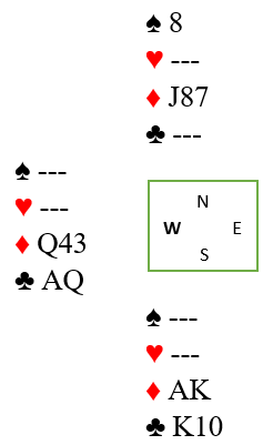 Ø/V hadde altså tatt tre stikk og nord var inne. Da spilles alle trumfene bortsett fra en. Det blir kun fire kort igjen, og det må kastes litt uvanlig fra syd hvor det for at denne criss-crossen skal virke må være igjen to kløver, og dermed kun plass til A-K dobbel i ruter. Men å ta ruterfinessen har vi altså slått fra oss, vi tror vest har ruter dame.