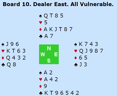 6 kløver er ganske bra. Det er forskjellige muligheter for spilleplan. Etter hjerterutspill stjal den nederlandske syd en hjerter, tok for A-K i ruter med sparavkast og spilte seg over til syd på spar ess. Så stjal han den tredje hjerteren med kløver ess, stjal en spar og spilte trumfkongen. Nå, etter at han hadde brukt trumfesset til å dekke opp en hjerter var han avhengig av enten singel knekt eller dame i trumf, eller 2-2 sits. Slik det satt ble det +1370 og nok en gang 13 IMP til Nederland da Norge noterte +620 i 5 kløver ved det andre bordet.