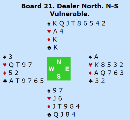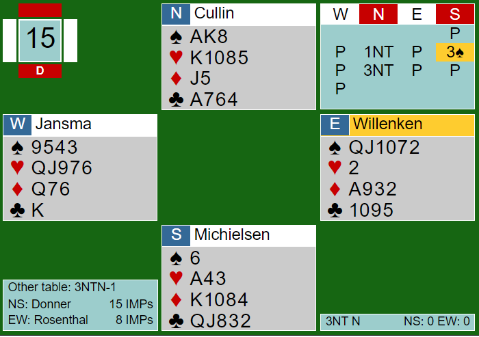 Ved det andre bordet lasjerte Rosenthals spillefører Silverstein sparutspillet og stakk neste spar. Så spilte han seg over til syd på hjerter ess og dro kløver dame. Men da det førte til at det ble en kløvertaper til østs 10-9-5 var det for sent å godspille det niende stikket. En bet og +100 til DONNER ga dem ytterligere 12 IMP. Det norske parets lag, uten nordmennene "på banen" altså, tapte de første femten spillene med 8-27. Hengende litt bakpå ble det noen flere IMP i de neste settene, og til slutt tapte de kampen med 66 IMP (167-101).