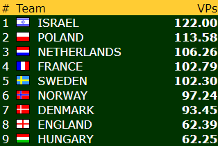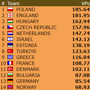 Etter to dager av Ungdoms EM leder de norske jentene i U26W-klassen. De har tapt to kamper, men fem solide seiere har gitt 97VP (snitt nesten 14VP per kamp) og omtrent 10VP ledelse foran Polen. Nederst i dette innlegget tar vi med et gladspill fra en av det norske lederlagets kamper.