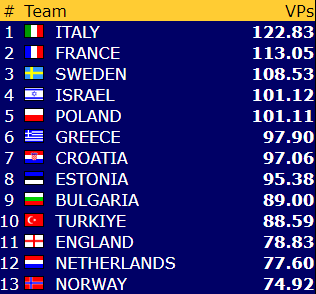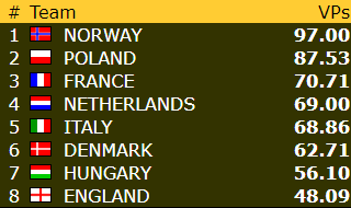 U26 Women Norge - Danmark 4,42 - 15,58 (IMP-score: 17 - 37) Norge - England 18,54 - 1,46 (IMP-score: 51 - 13) Norge - Italia 7,1 - 12,9 (IMP-score: 36 - 45) Norge - Ungarn 10,71 - 9,29 (IMP-score: 13 - 11)