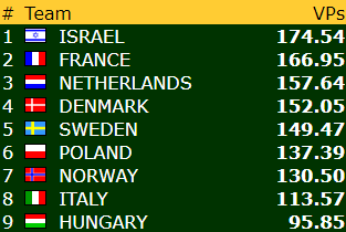 U16 Norge - Tyrkia 8,62 - 11,38 (IMP-score: 26 - 30) Norge - Israel 6,29 - 13,71 (IMP-score: 29 - 41) Norge - Hellas 4,54 - 15,46 (IMP-score: 17 - 32) Norge - Ungarn 5,07 - 14,93 (IMP-score: 18 - 35)