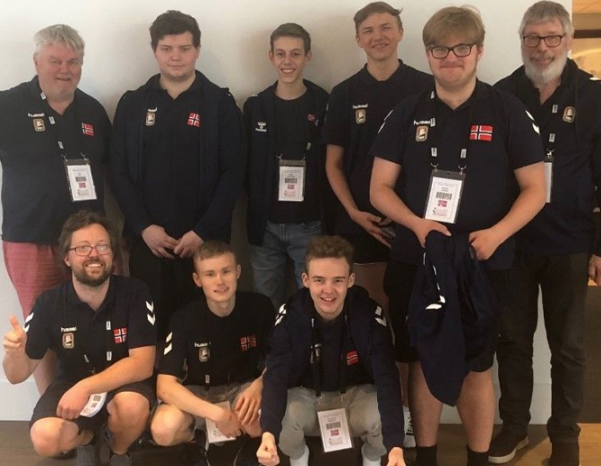 Norges U21-lag kunne slippe jubelen løs etter å ha avsluttet med to storseire. Dermed var VM-billetten sikret. Stående fra venstre ser vi Lars Eide (NPC), Arne Osnes Devik, Anders Brogeland, Magnus Sætre, Thomas Tøsse og Sten Bjertnes (coach). Sittende ser vi fra venstre Kristian B. Ellingsen (coach), Christian Fredrik Johnsen og Are B. Landsvik.