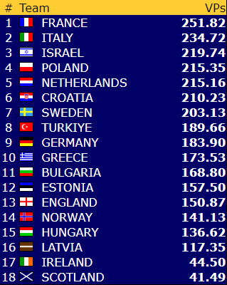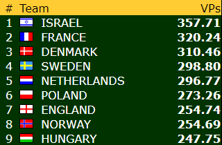 Tirsdag ble Ungdoms-EM i Veldhoven avsluttet. Sett med norske øyne var det stor spenning knyttet til om Norge ville kvalifisere seg for neste års VM ved å sikre ei topp åtte-plassering. Før de tre siste kampene var avstanden ned til niendeplassen 15 VP. I dagens første kamp ble imidlertid laget knust av Danmark med IMP-sifrene 8-66, og dermed fikk de ikke med seg ett eneste vinnerpoeng. Avstanden ned til niendeplassen krympet samtidig til mindre enn to vinnerpoeng.