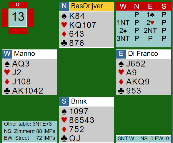 Begge lag var i 3NT. For lag ZIMMERMANN spilte øst utgangen, mens lag STREET fikk kontrakten på vests hånd.
