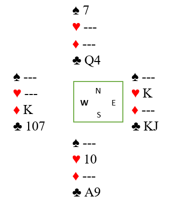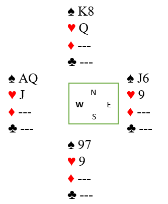 Spillefører stakk altså med hjertere ess og spilte kløver til honnør fra syd og kongen hos vest. Så ruter til bordet og mer kløver. Da den andre honnøren kom fra syd hadde spillefører elleve enkle stikk, og en farlig sparfinesse behøvdes ikke. Han tok stikkene sine, elleve enkle, men han kunne fått tolv stikk. Idet alle kløverstikkene og ruterstikkene er tatt ser det slik ut: