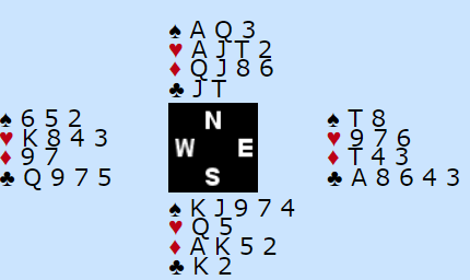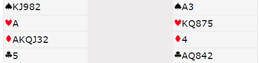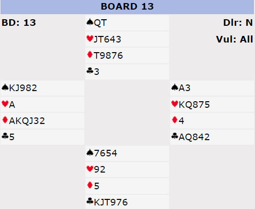 Ved det andre bordet spilte Ø/V 6NT, og spillefører var der etter denne skvis/show-up posisjonen (men i grand kunne han ikke trumfe en kløver), men han gikk seg en bet der også, uavgjort spill.